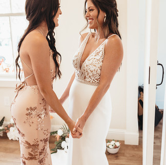Hayley’s sister was the maid of honor in a sparkling champagne dress with sequin details. The bridesmaids wore mismatched champagne and rose gold dresses. The groom and groomsmen wore black suits, matching black ties, and white dress shirts. The florals were a mixture of white orchids, peach tones, and greenery.